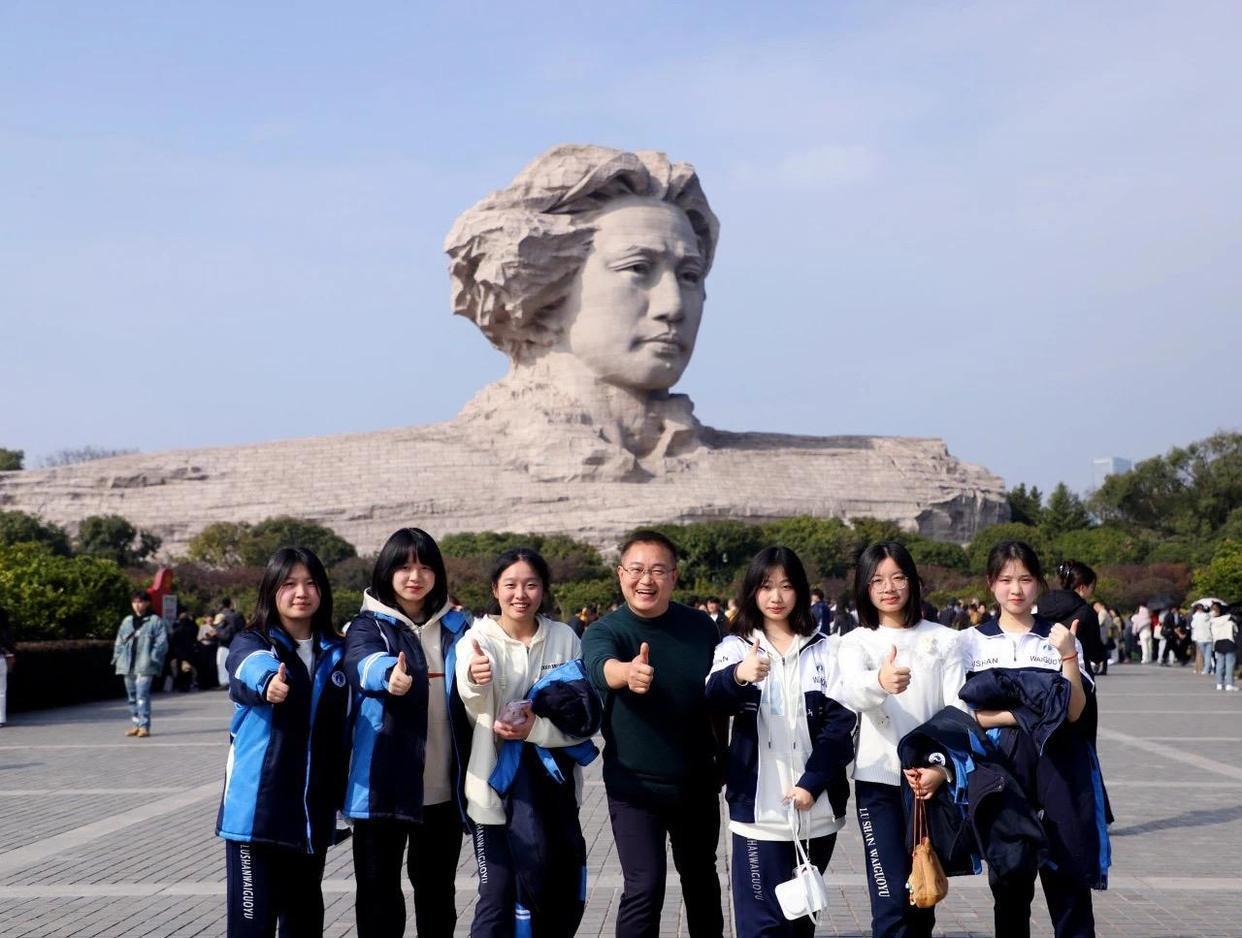 清晨,全体师生有序出发,乘坐地铁直达橘子洲,途中四个班级在橘子洲站出口前坪会合,秩序井然。湘江碧波荡漾,洲头绿意萌发,学子们沿江畔步道向青年毛泽东雕像徒步进发。行进途中,师生相互扶持、笑语不断,春日暖风拂过一张张朝气蓬勃的脸庞。