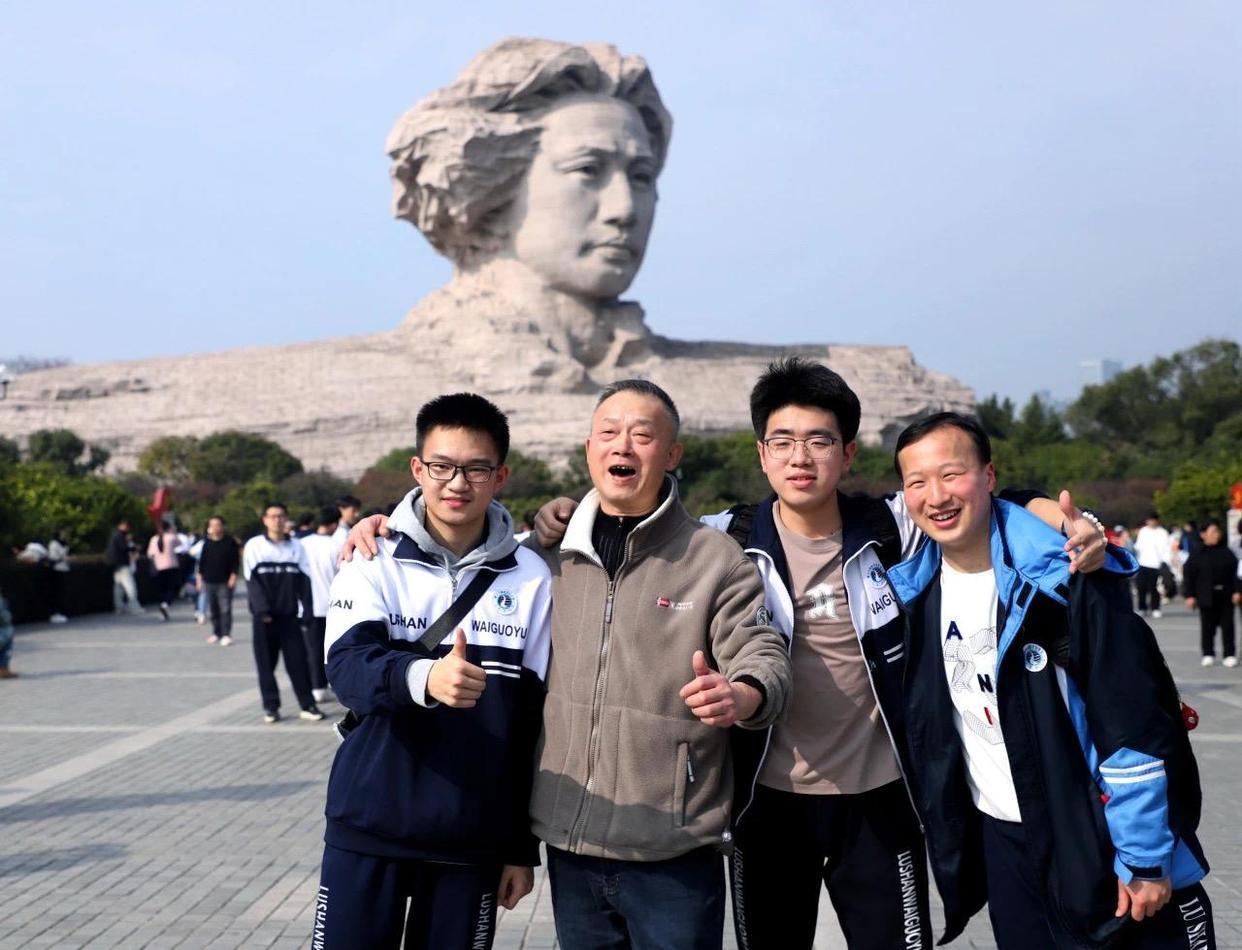 抵达橘子洲头后,校长张辉发表了鼓舞人心的讲话,鼓励同学们在高考冲刺阶段勇敢挑战自我,超越极限。随后,全体师生及家长在主席雕像前齐声朗诵《沁园春·长沙》,以激昂之声致敬伟人,抒发对未来的热切期望。